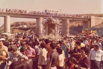 La fotografía es de 1971 o 1972, ya que en 1973 se estrenaron las actuales carretas de papelillos que aun no existían en la fecha en que fue tomada la foto.La carreta de plata con el Simpecado verde donado por la familia Villarreal Baños que durante algunos años se utilizó para la Romería va adornada con flores blancas, entre ellas gladiolos, y aun no se llevaba la imagen del Pastorcito. Al fondo vemos el antiguo puente del Viar con su barandilla más peligrosa que la actual, aun no se había construido el puente nuevo paralelo a este.