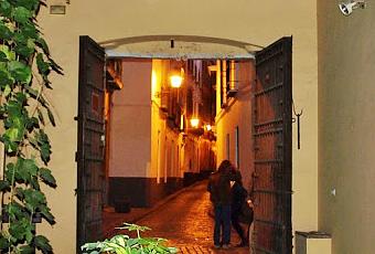 Como es frecuente en las casas palacios sevillanas del siglo XVI el acceso al patio principal se hace en ángulo recto con relación a la puerta de la calle a través de un vestíbulo. De este vestíbulo al que accedemos por la escalera de la foto inferior, hablaremos mañana.