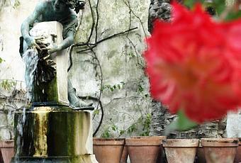 En este pequeño rincón del Jardín Chico de la Casa de Pilatos nos encontramos con una fuente hexagonal presidida por una estatua de un infante sentado y apoyando su pie izquierdo sobre el caparazón de una tortuga, en lo que bien podría ser una representación de Neptuno a pequeña escala.