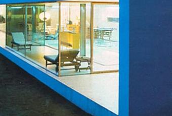 De este modo, la piscina (excavada en el propio montículo en el que se apoya la construcción) forma parte también de las dependencias diurnas y comunes, pero también, dada su proximidad con el cuarto de baño (por uno de los laterales acristalados), en un complemento de la zona de aseo.Las paredes de cristal que rodean la piscina pueden abrirse y cerrarse, ampliando el espacio interior de las estancias colindantes o convirtiéndola en una vitrina-estanque, revestida con un mosaico vítreo de 1x1cm y techado de madera.