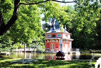 Esta construcción, de dos alturas, con pinturas de estilo pompeyano, coronada por un chapitel de plomo y a la que se accede por una pasarela, se encuentra sobre una isla en el centro de un pequeño lago que antaño servía para pescar.