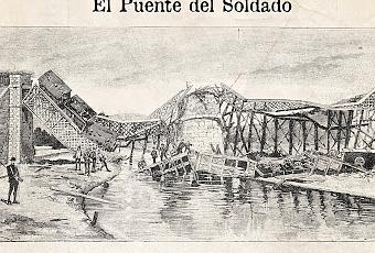 Otro grave accidente se produjo el 25 de septiembre de 1938 en la estación de Martorell (Barcelona). En un momento álgido de la guerra civil, cuando estaba ocurriendo la decisiva batalla del Ebro, el accidente fue silenciado por completo. Las cifras de muertos y heridos varían de unas fuentes a otras, oscilando entre cantidades tan dispares como 30 y 200. La causa del accidente parece ser que fue el choque de dos trenes a la salida de dicha estación, uno de ellos cargado de mercancías y el otro lleno de viajeros, militares y civiles, los cuales se dirigían hacia el norte ante el avance de las tropas franquistas. En la posguerra hubo también dos accidentes terribles. Uno de ellos ocurrió el 9 de julio de 1939 en la estación de Peñaranda de Bracamonte (Salamanca), cuando se produjo la explosión de una gran cantidad de municiones que se encontraba a bordo de un tren. Murió un centenar de personas y más de mil resultaron heridas. Cinco años después sucedió el que probablemente haya sido el más grave accidente ocurrido en la historia del ferrocarril en España. El 3 de enero de 1944 en Torre del Bierzo (León) se produjo un doble choque entre un tren de pasajeros, otro cargado de carbón y una locomotora que hacía maniobras. Aunque el balance oficial de víctimas fue de 78 muertos y 75 heridos, parece ser que la cifra real de fallecidos pudo ser de 150 a 200, si bien algunos autores elevan la cifra hasta 300 e incluso 500.El accidente de AlcudiaEn 1866 circuló el primer tren de la línea Madrid-Badajoz, ya que hasta 1859 no fueron aprobados por el Gobierno los tramos Ciudad Real-Mérida y Mérida-Badajoz, Así concluía para Minas de Almadén el engorroso envío de más de 30.000 frascos de mercurio (de 34,5 Kg. cada uno) anuales a Sevilla en lentas carretas de bueyes o a lomo de caballerías, para que después fuera transportado a Cádiz por el Guadalquivir y embarcado para Londres. A partir de entonces, el mercurio fue llevado en tren hasta el nudo ferroviario de Almorchón (Badajoz) y de allí también en tren hasta Cádiz. En esa época, la comercialización del mercurio de Almadén era efectuada por los Rothschild, banqueros judíos con los que la Hacienda española, en bancarrota, venía firmando sucesivos empréstitos desde 1835.En el punto kilométrico 279 de esta línea férrea ocurrió el 27 de abril de 1884 uno de los accidentes más graves ocurridos en España. En esa zona, dentro de la dehesa de Castilseras, la vía cruza el río Alcudia, que en aquella madrugada llevaba mucha agua por las fuertes lluvias primaverales de los días anteriores. En el siniestro perdieron la vida 53 personas y otras 16 resultaron heridas, en su mayor parte soldados recién licenciados de los regimientos Castilla y Granada, quienes volvían a sus lugares de origen. Desde entonces, a ese puente se le conoce como el puente de los soldados.La noticia llega a MadridA las pocas horas del siniestro la noticia ya había llegado a la capital y el periódico El Día publicaba que “las proporciones de la catástrofe hicieron olvidar anoche que era día de lucha electoral. No se hablaba de otra cosa en las calles, en los círculos, en los cafés, en las casas particulares, en todas partes. La impresión que produjo en los primeros momentos la noticia fue muy grande y enseguida se dieron las gentes a buscar la causa de tan infame atentado. Algunos, con impremeditación muy grave cuando faltan pruebas, murmuraban el nombre de algún partido político. Estos eran los menos, pues en realidad nadie sabía a qué atenerse y se esperaban nuevas noticias”.