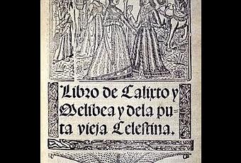 Portada de La Celestina Esta portada de una de las ediciones de La Celestina de 1502 y que se conserva en la Biblioteca Nacional de Madrid recoge el momento crucial de la obra, el encuentro amoroso entre Calisto y Melibea en el jardín de su casa. La ilustración parece un boceto para la representación, incluso figuran las iniciales de los nombres de los personajes. Tras Melibea se encuentra su criada Lucrecia y detrás de Calisto está Pármeno, cuidando su caballo. Celestina aparece fuera de escena llamando con la aldaba en casa de Melibea.La Celestina tuvo un éxito de publico extraordinario desde su primera aparición por eso se conservan bastantes ejemplares que proceden de primeras ediciones antiguas e incluso tempranas traducciones. El texto de estas ediciones no es el mismo ya que el autor fue modificando la obra. La primera edición y más antigua de las conservadas se imprimió en Burgos, por Fadrique de Basilea en 1499, y consta de dieciséis actos con el título de Comedia de Calisto y Melibea. Hubo después varias segundas ediciones de Toledo, Valencia y Salamanca (1500), de las que se conserva la de Toledo, impresa por Pedro Hagenbachc, que añade los versos acrósticos. Estos libros tienen en común el título, que constan de dieciséis actos, que incluye una carta del autor a un amigo en el que le dice que se ha encontrado un texto anónimo y que como le ha gustado mucho ha decidido reunirlo todo en un acto —el primero— y concluir la obra. Después siguen los versos acrósticos sobre la intención de la obra en los que figura su nombre, aunque ningún ejemplar está firmado. Entre 1502 y 1507 aparecieron muchas ediciones ampliadas y con el título de Tragicomedia de Calisto y Melibea, y también El libro de Calisto y Melibea y de la puta vieja Celestina, en Sevilla, Toledo, Salamanca y Zaragoza; ésta, de 1507, es la más antigua que se conserva de la Tragicomedia, que inserta cinco actos nuevos entre el XIV y el XV de la Comedia, fijándose el texto en veintiún actos definitivamente. Dado el enorme éxito de la obra y la garra del personaje de la alcahueta empezó a llamársela La Celestina, título que ha triunfado, y además el nombre del personaje ha pasado a designar en el léxico español a aquellas mujeres que median en amores bien por interés o gusto.