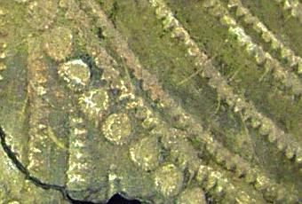 Impresiones del canto del cardium y del natis (circulares) en una pieza cardial del Museo de Alcoy.