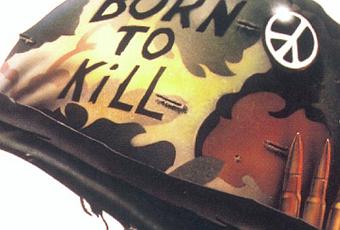 -“Nacido para matar” en el casco y una insignia de paz en la solapa. ¿Qué es esto, una broma de mal gusto?