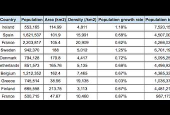 Atenas , Grecia ocupa el octavo lugar, con 26.601 habitantes por kilómetro cuadrado. Atenas es la ciudad más pequeña en cuanto a su tamaño, con 38,96 kilómetros cuadrados . Su densidad actual es similar a la de París, pero la tasa de crecimiento demográfico en Atenas es mucho más lenta. A finales de siglo su población será de 1,03 millones.