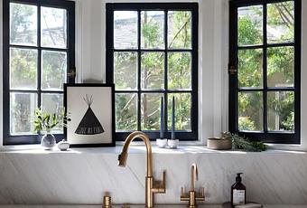 Sklar eligió un grifo de Newport Brass, encimeras de mármol Calacatta Delicato, y Benjamin Moore para las ventanas. Sus mostradores en mármol blanco son una buena opción para una cocina muy familiar pues se limpia muy bien.