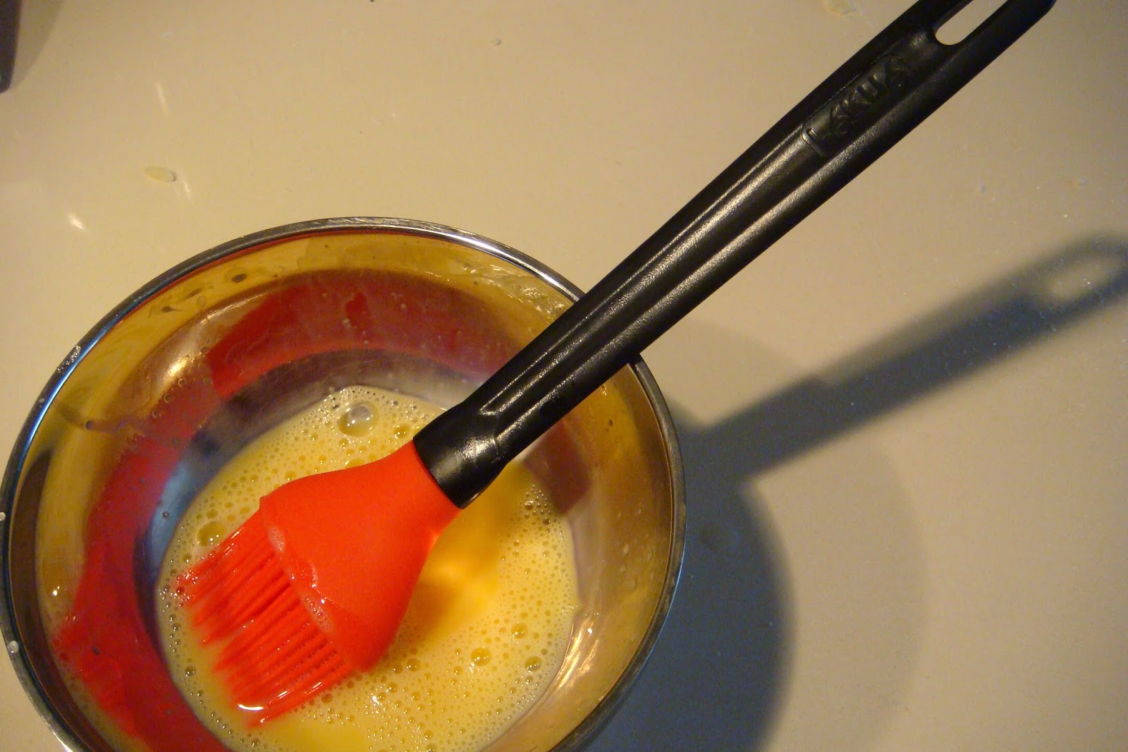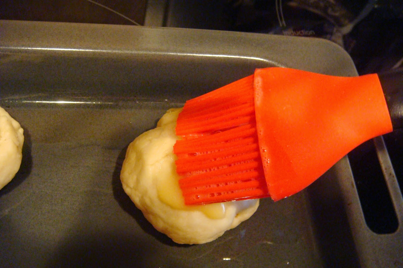 5. La receta dice que hay que dividir la masa en pequeños bollos de 50 grs cada uno, pintarlos con huevo y azúcar humedecido (yo lo he hecho con el pincel de silicona de Lekué) y dejarlos reposar dos horas en un lugar templado, sin corrientes. Yo creo que primero debe dejarse reposar la masa y después hacer los bollitos, pero aún así lo he hecho como decía la receta. Se deben colocar en una supericie untada con aceite o mantequilla, para que no se peguen, y hay que hacerles un corte central con un cuchillo afilado.