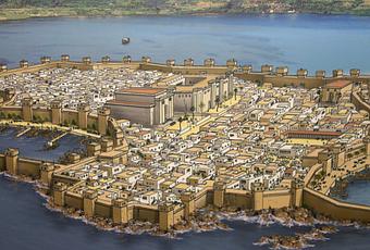 Recreación de la ciudad de Tiro en el siglo VII a.C. Lámina en Museo Arqueológico de Vélez (MUVEL) Vélez-Málaga, Málaga.