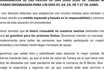 Ante la grave crisis sanitaria provocada por el Coronavirus, la @comisión de Fiestas Toreno informa de la cancelación de las fiestas de este año que se hubieran celebrado en junio.