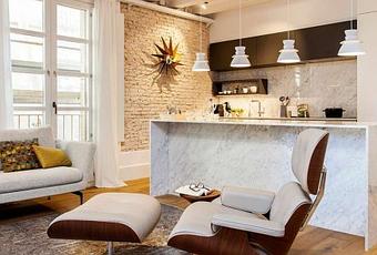 Sorprendente distribución en la que la cocina cobra protagonismo porque se une en el espacio a una sala en la que la luz realza el ladrillo y la poltrona Eames que parece bailar en el interior.