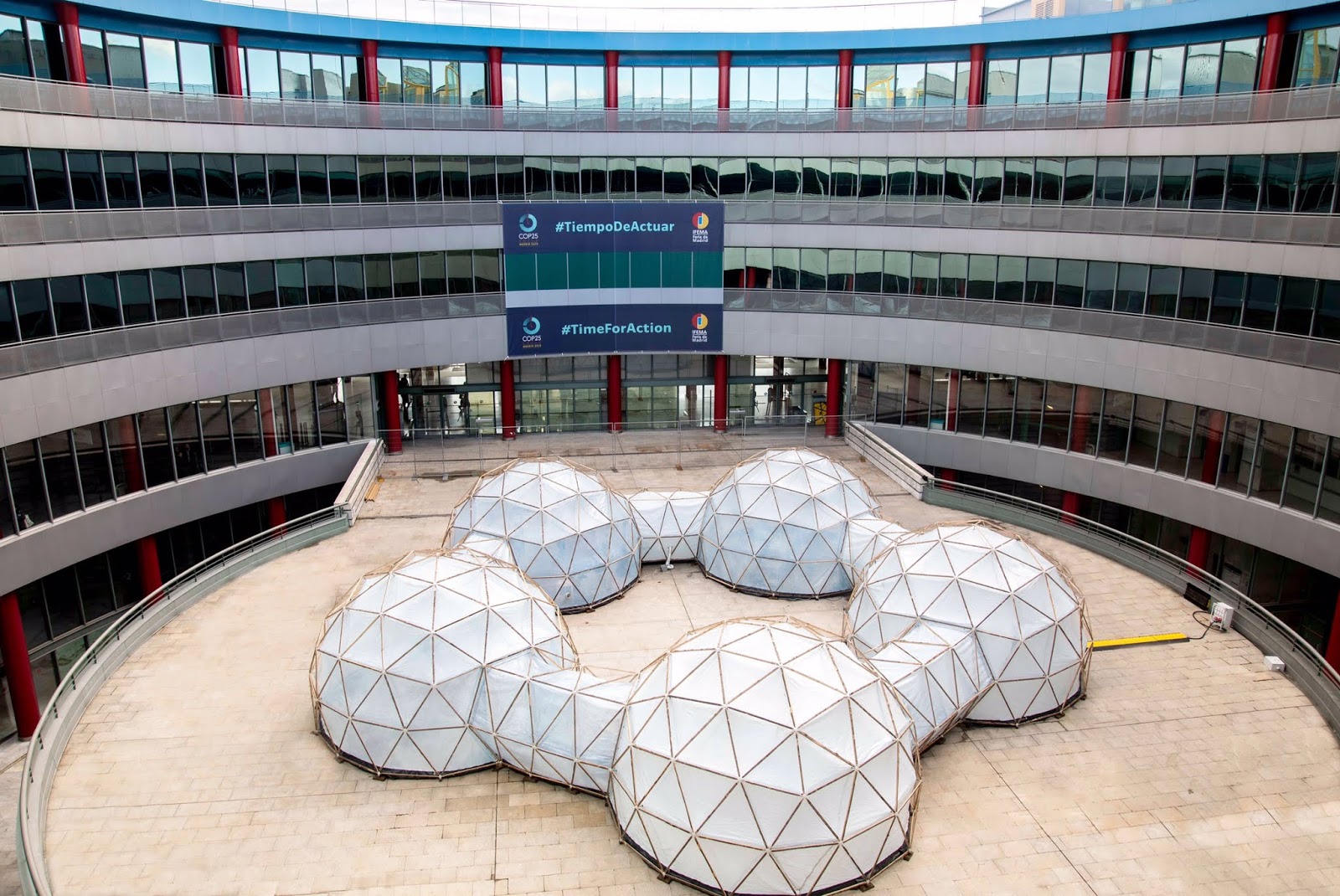Una espectacular instalación preside el patio circular del recinto de Feria de Madrid, desde hoy y hasta el día 13 de diciembre, fecha en que finaliza la Cumbre Mundial del Clima, COP25, que simboliza la situación que viven las grandes ciudades de altas tasas de polución.Así, los visitantes a la COP25, podrán conocer, de la mano de ‘Pollutionpods’, el área que recrea bajo el lema de la conciencia climática, los niveles de polución existentes en ciudades como Nueva Delhi, Londres, Sao Paulo, y Beijing, a través de una serie de cúpulas geodésicas interconectadas formando un anillo. Se trata de una simulación de laboratorio que emula, a través de aromas artificiales y perfumes, las partículas de dióxido de nitrógeno y azufre y el monóxido de carbono presente en el aire de en las urbes con mayor densidad de población, industrias y automóviles. Una experiencia que permite, al visitante, atravesar células cada vez más contaminadas y conocer el riesgo que supone para la salud respirar un aire contaminado, realidad para millones de personas en todo el mundo, además de conocer aquellas acciones que promueven esta situación. El primer lugar en experimentar el trabajo del artista visual, Michael Pinsky, autor de están inmensa instalación, fue el Festival Starmus de Noruega. A partir de esa primera aparición, más de 200.000 personas han podido oler y sentir este ambiente contaminado a través de esta gran instalación que estos días visita Madrid, que ha sido exhibida en espacios públicos de ciudades como Ginebra, Manchester, Nueva York, París y Vancouver, como una llamada de atención a instituciones, gobiernos, organismos y sociedad civil.