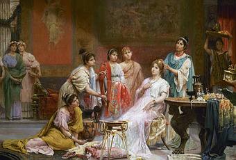 Una matrona romana es maquillada y peinada por sus esclavas en el tocador. Óleo por Juan Giménez Martín. Siglo XIX. Congreso de los Diputados, Madrid.