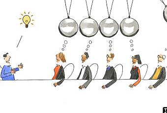 Nos quejamos de la poca imaginación que tiene la organización pública, y puede que la culpa sea por ese adjetivo: "pública". ¿Nos referimos a que la empresa privada es más creativa o tiene equipos con mayor imaginación? No, por supuesto, que no. La palabra "pública", además de indicar que la organización pertenece a la administración pública, también señala que se debe adaptar a unas normas predefinidas por el derecho administrativo. Y como os podéis imaginar, esa rama del derecho no invita mucho a la creatividad.La inmensa mayoría de las decisiones que se toman en el ámbito de la administración pública se hace en el seno de comités o comisiones regladas, con su reglamento, con su carácter de órgano colegiado (tal y como señala la mítica Ley 30/1992, la que dota de esqueleto a los actos administrativos), y con una serie de (aburridas) obligaciones que cumplir que impiden que la discusión y las ideas fluyan con libertad. Por supuesto, hay que actuar siguiendo la ley, pero sin tantas rigideces o al menos sin acudir a la burocracia como excusa ante la poca agilidad. Este tipo de comités/grupos/comisiones, van más encaminados a criticar que a crear, no son entornos creativos que permitan enriquecer de forma colectiva las ideas y así resolver problemas o generar nuevos escenarios con la potencia grupañ. Para ilustrar esta disquisición, robamos a Tom Fishburne un dibujo y una cita del New York Times que incluye en su blog en una entrada dedicada precisamente a la falta de creatividad en los grupos: