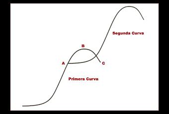 La genialidad de Handy está en enlazar dos curvas como se muestra en el gráfico, de modo que introduce un factor de gestión estratégica en la gráfica. Así, si nos dejamos deslizar por la curva simple, por esa S tumbada, nuestro futuro está escrito y nuestra decadencia social o empresarial es un hecho. Pero al enlazar la nueva curva el mensaje cambia y ahora cabe la posibilidad de iniciar una nueva fase de desarrollo y evitar la decadencia de la vieja curva.