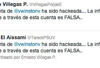 El ministro para la Comunicación e Información, Ernesto Villegas, informó la noche de este miércoles que la cuenta en la red social Twitter del animador y actor Winston Vallenilla ha sido hackeada. “La cuenta de @vwinstonv ha sido hackeada… La información que se divulgue a través de esta cuenta es FALSA”, escribió el ministro en su cuenta @VillegasPoljakE, minutos después de que fueran emitido un mensaje sobre la salud del presidente Hugo Chávez desde la cuenta hackeada de Vallenilla.