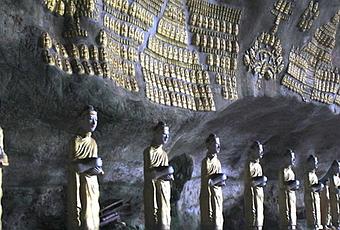Cientos de iconos de oro en miniatura, no mucho más grandes que cartas forman un mosaico en la parte derecha de la cueva. Usted pasará en una pagoda aproximadamente del tamaño de una pequeña furgoneta y entonces la luz se debilita. Los visitantes deben quitarse los zapatos. Sólo entonces el hedor de los excrementos de murciélago llenan las fosas nasales. A veces se puede oír el chillido de los murciélagos.