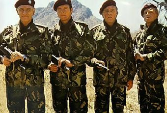 La película nos lleva desde el Londres inicial, en el que Burton recibe el encargo y trata de reunir a su grupo (Moore es un esbirro del crimen organizado metido en problemas y Harris anda ya retirado, preocupado tan sólo por cuidar de su hijo de nueve años), al entrenamiento en Swazilandia y Rhodesia (este país se independizó de Reino Unido en 1980 y pasó a llamarse Zimbabwe) y, finalmente, a un país indeterminado de la zona de los Grandes Lagos (Uganda, Ruanda, Burundi…) en el que tendrá lugar toda la segunda mitad de la cinta, antes de volver a Londres para la conclusión justiciera previsible. Poco, por tanto, se puede rascar de la película en el aspecto de la trama (frases altisonantes en referencia a la libertad de los pueblos en plena era de la descolonización; cambios de actitud, como en el caso de Krüger, militar sudafricano del apartheid, racista por tanto, que descubre en el discurso del político negro nuevos horizontes vitales; personajes planos y esquemáticos) o en el de la acción (la precariedad de medios, con una o dos excepciones –el bombardeo del puente y el ataque con la ballesta-, priva de verdadera elaboración de las secuencias de tiroteos y explosiones, quedando a veces la acción principal fuera del encuadre). Los intérpretes se limitan a cumplir, algunos dando de sí todo lo que pueden dar (los más limitados, Krüger y Moore, éste, no obstante, se luce con unas cuantas frases de guión al más puro estilo del humor inglés y también en la línea de su caracterización irónico-sarcástica de sus películas de James Bond), y otros desperdiciados, dando mucho más de lo que merece una película tan mediocre y banal (Burton, pero, especialmente, Richard Harris, el único atisbo de elaboración psicológica que parece haber en un personaje, que le debe más a su interpretación que al dibujo hecho en el guión), y la labor de dirección, rutinaria, expeditiva, directa al grano, no busca ni recrearse en unas secuencias de violencia elaboradas ni espectaculares, ni tampoco explotar los magníficos paisajes africanos con el fin de transmitir emociones o enriquecimiento estético de ningún tipo.