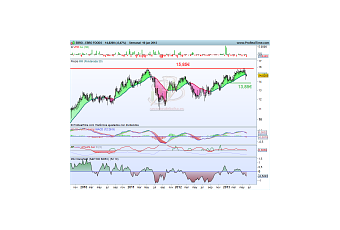 Sin embargo el precio no solo no ha podido romper los 15,85€ si no que se ha debilitado. La semana pasada terminó cerrando la vela por debajo de la media de 30 sesiones y en la que estamos sigue cotizando por debajo de la misma. Por otro lado el Macd ha dibujado una divergencia bajista entre mayo del 2011 y mayo de 2013 que puede ser la razón por la cual el valor se ha debilitado y esto se refleja en el RSc Mansfield que muestra un empeoramiento del comportamiento de Ebroo Food frente al S&P 500.