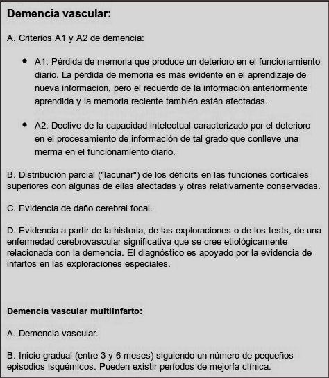 Resumiendo algo de lo ya expuesto, hablamos de Demencia Vascular (DV) cuando se presenta un deterioro cognitivo (global) que es consecuencia directa (primaria) de una enfermedad vascular cerebral (isquémica / hemorrágica). Este síndrome (conjunto de signos y síntomas) tiene una causa (o etiopatogenia) debida a múltiples factores (multifactorial) propios del amplio espectro existente en la patología vascular cerebral.En cuanto a su incidencia, esta resulta ser muy importante, siendo la segunda causa de demencia en nuestras sociedades desarrolladas (cerca del 20% de los casos). También se conoce que aproximadamente un 80% de los accidentes vasculares cerebrales son de tipo isquémico (aterotrombótico / cardioembólico) y sólo cerca del 20% es de tipo hemorrágico. [Ver aclaración de estos términos en mi anterior artículo sobre la Demencia Vascular (I)]Por otra parte, la enfermedad vascular cerebral es muy relevante por constituir un factor de riesgo en la aparición de deterioro cognitivo en la vejez (y que puede derivar hacia un síndrome demencial) algo que es potencialmente prevenible a través del control de los factores de riesgo asociados.CRITERIOS DIAGNÓSTICOS:Actualmente, no se puede hablar de la existencia de unos criterios diagnósticos universales o mayoritariamente aceptados. Estos se han venido desarrollando tomando como referente a la demencia tipo Alzheimer y basándose en el consenso de grupos de expertos. Esto de por sí ya constituye un factor de confusión al basar el diagnóstico en la presencia de una alteración en la memoria que es muy poco frecuente en los casos de demencia vascular en sus estadios iniciales.Muy al contrario, los pacientes afectados por una DV presentan síntomas específicos que los diferencian de los pacientes con Enfermedad de Alzheimer (EA). Así, en la demencia subcortical (tipo vascular) suelen darse los siguientes síntomas: - Alteración en la marcha. - Funciones cognitivas enlentecidas. - Síntomas de tipo afectivo (apatía, depresión).Por otra parte, habrá de tenerse en consideración que la manifestación clínica de la DV va a variar dependiendo del tamaño, localización y etiología del daño vascular concreto. Por esto, hoy en día tiende a considerarse a la DV como un espectro clínico amplio.Como norma general, los requisitos que han de estar presentes para llegar a un posible diagnóstico de DV son los siguientes: 1) Deben darse los criterios propios de una demencia. 2) Evidencias de Enfermedad Cerebrovascular, avaladas por: - Historia clínica previa. - Pruebas de Neuroimagen (Resonancia Magnética / TAC).La implicación de la enfermedad vascular cerebral como potencial causa de demencia, ha venido siendo supuesto desde hace más de cien años. En la actualidad se ha venido produciendo una nueva definición de las distintas variantes de la DV, introduciéndose el llamado Deterioro Cognitivo Vascular. También se han podido estudiar otras formas de lesión vascular cerebral como la denominada leucoaraiosis, junto a las formas ya conocidas (infartos de tipo lacunar y arteriales).Entre los principales Criterios Diagnósticos de la DV, podemos encontrarnos los siguientes:* DSM-IV(Diagnostic and Statistical Manual of Mental Disorders):Conceden al déficit en las funciones mnésicas una gran relevancia, en detrimento de la presencia de otros déficits que en la DV tienen suma importancia (véase la existencia de síntomas apráxicos, afásicos, agnósicos o de alteración en las funciones ejecutivas). El criterio básico lo constituye el haber sufrido un accidente cerebrovascular previo.Este tipo de criterios resultan algo incompletos a la hora de diagnosticar una DV, pues en su conjunto presentan una serie de limitaciones importantes, a saber:1) No tienen en consideración los factores de riesgo implicados en la enfermedad vascular cerebral (hipertensión, diabetes, arritmias cardíaca, entre otros).2) No hacen referencia a las pruebas por neuroimagen (TAC / RM), o a los exámenes de tipo clínico, además de minusvalorar la evolución del proceso.