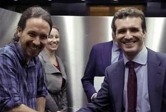 Una imagen de Pablo Casado, líder del Partido Popular, y de Pablo Iglesias, máximo dirigente de Unidas Podemos y vicepresidente del gobierno, ambos sonriendo y en un ambiente de cordialidad, se ha convertido en viral a pesar de que nadie asegure que es auténtica y de que no se trata de un montaje. Muchos se escandalizan cuando contemplan a adversarios políticos riendo y disfrutando juntos, pero si se profundiza en el análisis, se descubre que hay más cosas que les unen que las que les separan y que la política, como dicen los sabios, "hace extraños compañeros de cama" o también que "es demasiado importante para dejarla en manos de los políticos".