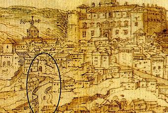 En otra panorámica de Toledo, anterior al Greco, efectuada también desde el norte de la ciudad en 1563 por el dibujante paisajista flamenco Anton van den Wyngaerde, igualmente, se puede distinguir la puerta de Perpiñán.