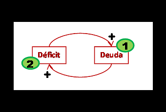 Cuanto mayor es el déficit, más aumenta la deuda, pues se requieren más créditos para hacer frente al déficit (y en el sentido contrario, si es déficit es negativo, habrá disponibilidad de recursos económicos para devolver una parte de la deuda). Por eso, en el esquema se ha puesto un signo positivo junto a la punta de la flecha que va del déficit a la deuda (V2 V1).