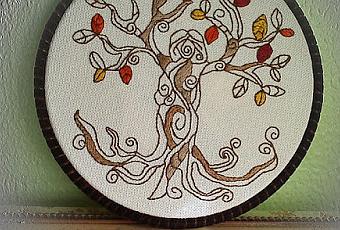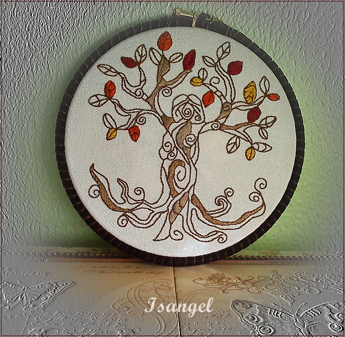 Hola de nuevo amig@s. Ultimamente no publico demasiadas cosas, pero no significa que no borde. Es solo que tengo cositas entre manos que aun no estan terminadas o listas para enseñaros. Pero ahora que ha llegado el frio a Sevilla, aun entran mas ganas de sentarse en la estufita y darle a la aguja.Ultimamente utilizo casi para todo el metodo de terminado con el bastidor, y es que resulta tan comodo, economico y vistoso... Ademas para regalos que tienen que ser enviados viene genial porque no corre riesgo de rotura, jeje.Este que os traigo hoy es un regalito para Cristy que se le escapo que le gustaban mucho los arboles, y encontre en Pinterest este diseño que dice ser la Diosa de los arboles.... asi que adecue el color de las hojas al otoño y rodee el bastidor con una fina cinta de terciopelo marron que me venia estupenda.