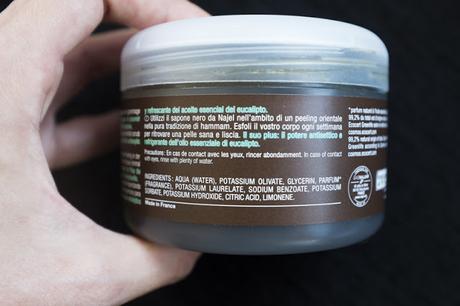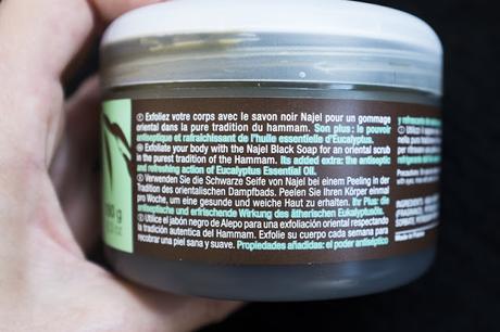 Lo primero que quería señalaros es que pone que es exfoliante, pero si es eso lo que buscáis deciros que no tiene ni una sola partícula. Lo que debería aclarar es que se usa para la exfoliación (con guante de crin por ejemplo) como parte el ritual de limpieza Hammam.