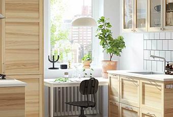 - Mobiliario en linea: Esta distribución está indicada en cocinas alargadas y estrechas. Se trata de amueblar únicamente uno de los lados de la cocina con distribución en línea. Eso sí, has de tener en cuenta que la zona de cocción y la zona de lavado (donde está el fregadero) no deben estar demasiado cerca. Cuida de que haya al menos 60 cm entre estos dos puntos.