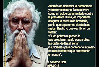 Luis Manuel Arce Isaac.─ "Si los pobres supiesen lo que se está armando contra ellos, las calles de Brasil serían insuficientes para contener el número de manifestantes que protestarían en contra", asegura Leonardo Boff, teólogo de la liberación y filósofo brasileño, a propósito del golpe de Estado a la presidenta Dilma Rousseff.Sin dudas, una dramática observación que se sale de las fronteras geográficas del enorme Brasil y llega a todas las costas americanas, incluidas las de Estados Unidos, porque implica e importa a la generalidad de las naciones.