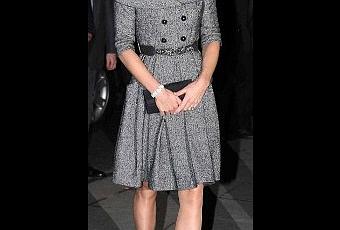 Catherine eligió un elegante vestido-abrido en tweed gris, con cinturón y falda tableada con vuelo por encima de la rodilla, by Hire Street, diseñado por Jesire, que se puede adquirir en muchas tiendas por departamentos a un precio aproximado de ciento cincuenta libras (unos 179 euros). Lo combinó con bolsito sobre y zapatos de salón de altísimo tacón en ante negro, el modelo Cosmic, de Jimmy Choo.