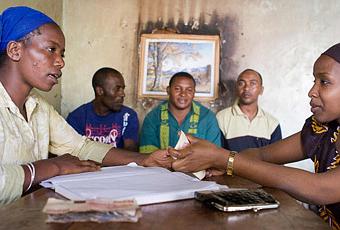 Dos mujeres tanzanas gestionan, en el año 2010, parte de los fondos con los que participan en un sistema empresarial cooperativo ante la mirada de tres hombres. /Foto: J. Marcos