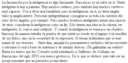 Me exasperó lo filosófico que estaba resultando, la falta de diálogos, lo arrogante (a lo Sherlock Holmes) de la protagonista, y tras haberlo hojeado y viendo que toda la novela tenía el mismo estilo, lo dejé. Y no pensaba retomar su lectura, hasta que me topé con esta reseña de Patt, a quien le había encantado el libro. En lugar de prometerle un vano "Ya lo leeré", le confesé que le había dado una oportunidad y no me había gustado, y esa fue mi sentencia.Al final me convenció de que le diera una segunda oportunidad. A su favor diré que he terminado el libro