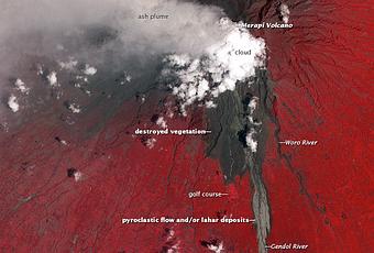Uno de los mayores peligros de una erupción como la del Monte Merapi son los flujos piroclásticos. Son avalanchas de calientes gases volcánicos y piedras que ocasionalmente pueden llegar a velocidades de 150km/h. El Merapi erupcionó a finales de octubre pasado provocando 272 muertos, 412 desaparecidos y 4.000 desplazados además de una enorme nube de ceniza.