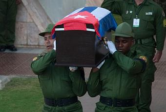 El pelotón de ceremonias de las Fuerzas Armadas cumple un riguroso protocolo para cuidar la urna de cedro que lleva las cenizas de Fidel. Al frente va el Teniente Coronel José Luis Peraza López, segundo Jefe de Departamento de Preparación de Infantería Física y Ceremonia de las Fuerzas Armadas Revolucionarias. El cargo formal tiene ese nombre larguísimo, mientras el informal es otro y contundente: se ocupó también del traslado de los restos de Ernesto Che Guevara, de La Habana a Santa Clara, en 1997.