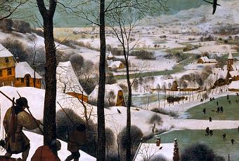 (Óleos del pintor flamenco del Renacimiento Pieter Bruegel el viejo: Cazadores en la nieve, 1565, El día oscuro o El día tormentoso, 1565, Fragmento de El día oscuro, ambas obras en el Museo de Historia del Arte de Viena, Austria.)