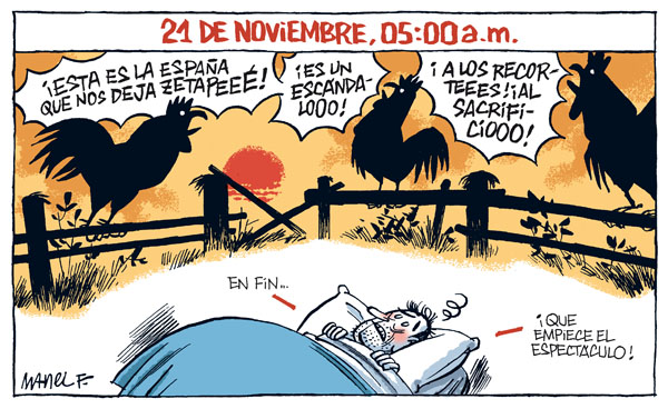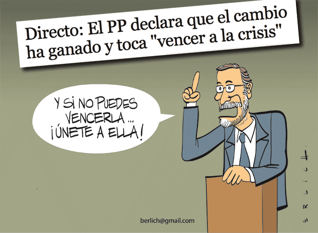 “El Partido Popular, con Mariano Rajoy al frente –escribe Cive Pérez en “Carnet de Paro”–, ha ganado las elecciones con una amplia mayoría. Eso es un hecho incontestable y el deber de cortesía me impone felicitar a don Mariano por su éxito, al tiempo que el instinto de supervivencia me aconseja tentarme la ropa. Con lo que no puedo comulgar es con esas ruedas de molino mediáticas que se empeñan en propagar —hacer propaganda— esa falsa moneda ideológica que sostiene que los españoles enviaron un mensaje claro de apoyo al nuevo presidente del Gobierno: un respaldo masivo al cambio. Incluso el rotativo de corte moderno y europeísta que pretende ser ‘El País’ no duda en encabezar la noticia con un titular: ‘España entrega al PP todo el poder”, que choca con el más elemental principio de realidad. Porque no ha sido 'España', sino el sistema electoral español, que es cosa muy distinta, lo que ha otorgado al PP esa aplastante mayoría en el Parlamento. Mayoría que obtiene a partir de los 10.830.693 votos recibidos en las urnas el pasado 20-N. Un resultado no tan brillante, ya que el PP de Mariano Rajoy sólo ha aumentado en 550.000 los 10.278.010 votos que obtuvo en marzo de 2008…