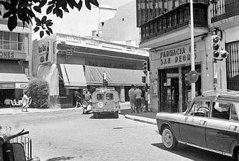 Si observamos con detenimiento la imagen, tenemos dos claves ya desaparecidas de nuestro caserío urbano, siendo el primero y mas llamativo el que esta junto al taxi, la entrañable Farmacia de San Pedro...