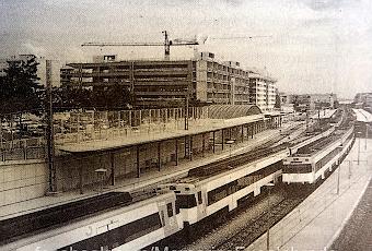 Imagen de 1997 de la estación de Fuenlabrada, antes de la llegada del Metrosur y cuya reforma es la que se mantiene hasta nuestros días. Aunque quizás nos llama más la atención la construcción del nuevo Ayuntamiento de Fuenlabrada, con su grúa.