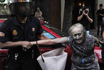 El antidisturbios (sin placa que lo identifique) la sujeta impertérrito. Probablemente piensa a ver si esta vieja bruja se cansa ya de resistirse y puedo llevarla al furgón con discreción, que tengo un fotógrafo detrás.