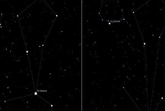 La constelación de Boyero como la vemos ahora en 2015 (izquierda) y como se vería en el año 20.000 (derecha), como se puede apreciar la estrella más brillante de la constelación, Arturo, se ha desplazado bastante sobre el fondo de estrellas así como la también la constelación de corona borealis.