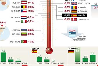 La contracción de la economía de Italia y Holanda en el cuarto trimestre fue muy acentuada: el 0,7%, respecto al precedente, mientras que la de Bélgica fue del 0,2% y la de España del 0,3%. La economía italiana ya registró una caída anual del 0,5% en el cuarto trimestre respecto al 2010 y la economía holandesa una contracción anual del 0,7%, lo que indica la gravedad de la crisis en ambos países. España, por el contrario, aún mantuvo un crecimiento anual del 0,3%.