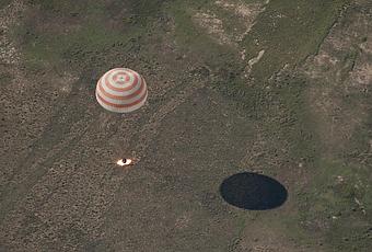 Arriba: Aterrizaje de la cápsula Soyuz en Kazajistán. Crédito: NASA/Bill Ingalls.Los tres astronautas regresan después de haber pasado unos cinco meses y medio a bordo de la Estación Espacial Internacional donde trabajaron como miembros de las tripulaciones de la Expedición 22 y 23.