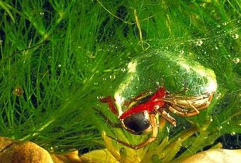 Aquí este video de la araña campana de buceo trabajando llenando su burbuja de aire y tirando a su presa en el interior: