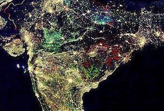 Esta bonita fotografía en color que lleva unos años dando vueltas por las redes sociales como una representación de la India vista desde el Espacio en la celebración del Diwali, no es real. Siento decir que es una fotografía falsa. La fotografía en blanco y negro que podéis ver abajo, fue tomada durante la festividad del Diwali en noviembre de 2012 por el satélite de la NASA Suomi NPP, pero es lo que se vería también cualquier otra noche (está algo retocada para distinguir lumínicamente bien las ciudades) La imagen coloreada muestra un montaje de tres noches diferentes realizada por el científico de NOAA (National Geophysical Data Center - National Oceanic & Atmospheric Administration) Chris Elvidge y representa el crecimiento de la población a través del tiempo: 1992 color azul, 1998 color verde y 2003 color rojo. Las luces blancas muestran las luces nocturnas que existían en los 3 muestreos.