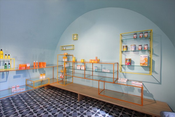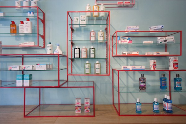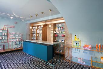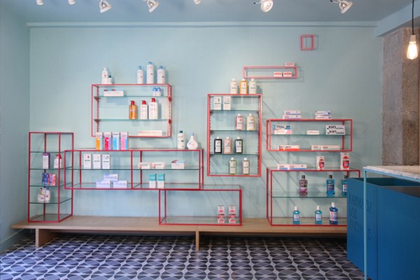 Rompiendo todos los moldes este diseño, de Stone Designs, para esta farmacia de Madrid es todo un logro en retro-chic, el suelo de baldosa hidráulica encaja a la perfección con las estanterías metálicas de colores, sin lugar a dudas un diseño original.