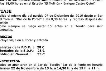 Precio para peñistas y abonados 28€ y precio público en general 33€. Para inscribirse en el Bar de El Toralín desde el viernes 22 de noviembre al miércoles 27 de noviembre. Es necesario dar el DNI y nº de socio o peña a la que pertenece. El resto de aficionados que vayan en otro medio de transporte, podrán recoger las entradas al precio de 15€