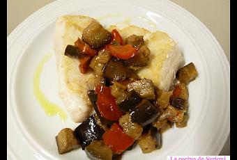 Ingredientes para 2 personas:300 gr de lomos de merluza1 berenjena1 pimiento rojoAceiteSalPimienta