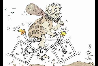 Las ruedas cuadradas en la viñeta no pretendían ser otra cosa que una especie de juego, de coqueteo con la invención de la rueda (la redonda, claro) pero ahora en Tecnópolis la ficción se hizo realidad ¿o la realidad imitó al arte?: Una bicicleta, o más exactamente en este caso triciclo de ruedas cuadradas es uno de los entretenimientos de la muestra para los niños. Claro, la forma del piso colabora en esto de hacer realidad la ficción. Y hablando de pisos y ruedas, fíjense el travieso detalle matemático geométrico: la longitud del arco de circunferencia rectificada es igual al lado del cuadrado. Lo que me lleva a una teoría delirante, si me lo permiten: es el piso, entonces, el que "circula" con sus lomadas precisas en una superficie plana formada por cada lado plano de la rueda.